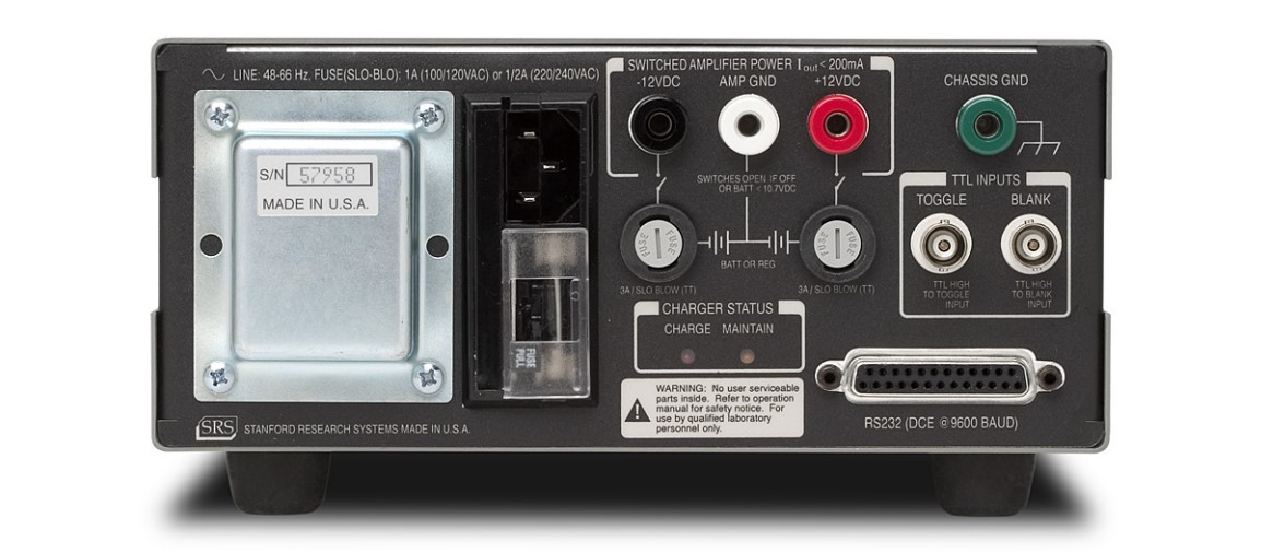 RS-232 接口允許以 9600 波特與 SR570 進行只聽通信。儀器的所有功能(開機除外)都可以通過RS-232接口進行設置。RS-232接口電子器件與 放大器電路光隔離,以提供最大的抗噪性。